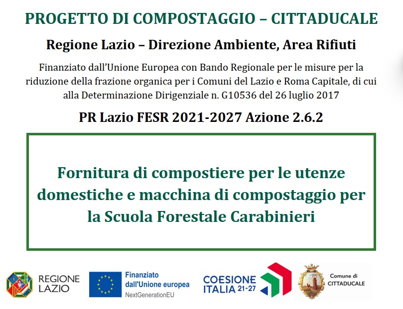 La Regione Lazio ha pubblicato un Bando Regionale per le misure a favore delle attività di compostaggio e auto-compostaggio per la riduzione della frazione organica per i Comuni del Lazio e Roma Capitale, di cui alla Determinazione Dirigenziale n. G10536 del 26 luglio 2017, al quale il Comune di Cittaducale ha partecipato con un progetto dell’importo complessivo di € 196.000,00.