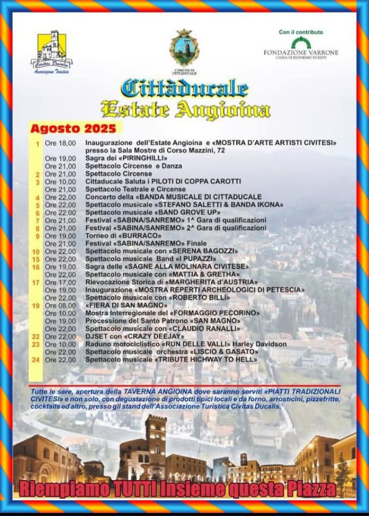È in programma dall’1 al 24 agosto la manifestazione “Estate Angioina 2025” che animerà il borgo di Cittaducale con un ricco calendario di esperienze culturali, sociali ed enogastronomiche rivolto a cittadini e turisti di ogni fascia di età.