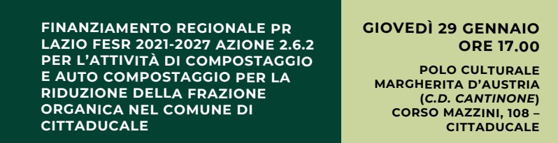 Il giorno Giovedì 29 Gennaio alle ore 17 presso il Polo Culturale Margherita d’Austria di Piazza del Popolo, Cittaducale si è tenuto un incontro con la cittadinanza, trasmesso anche via web. Al centro dell’incontro il finanziamento regionale PR Lazio FESR 2021-2027 azione 2.6.2 per l’attività di compostaggio e auto compostaggio per la riduzione della frazione organica nel Comune. Dopo i saluti dell’Amministrazione sono intervenuti il Direttore regionale, Wanda D’Ercole; il responsabile del Comune e del settore competente, Ivan Santocchi; l’ing.Gabriele Seri e Claudio Pansa di ECOPANS, per illustrare la macchina di compostaggio posta presso la Scuola Forestale Carabinieri, e Giuseppe Rinaldi con Francesca Morandini di Ancitel EA, per dettagliare la guida al compostaggio domestico. Ha chiuso gli interventi Alessandra Catena di Saprodir per le istruzioni pratiche sull’utilizzo delle compostiere. L'incontro si è concluso con le domande poste dai cittadini e con la distribuzione del materiale informativo relativo al compostaggio domestico.