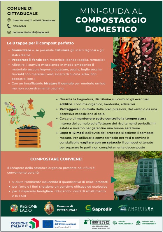 La Regione Lazio ha pubblicato un Bando Regionale per le misure a favore delle attività di compostaggio e auto-compostaggio per la riduzione della frazione organica per i Comuni del Lazio e Roma Capitale, di cui alla Determinazione Dirigenziale n. G10536 del 26 luglio 2017, al quale il Comune di Cittaducale ha partecipato con un progetto dell’importo complessivo di € 196.000,00.