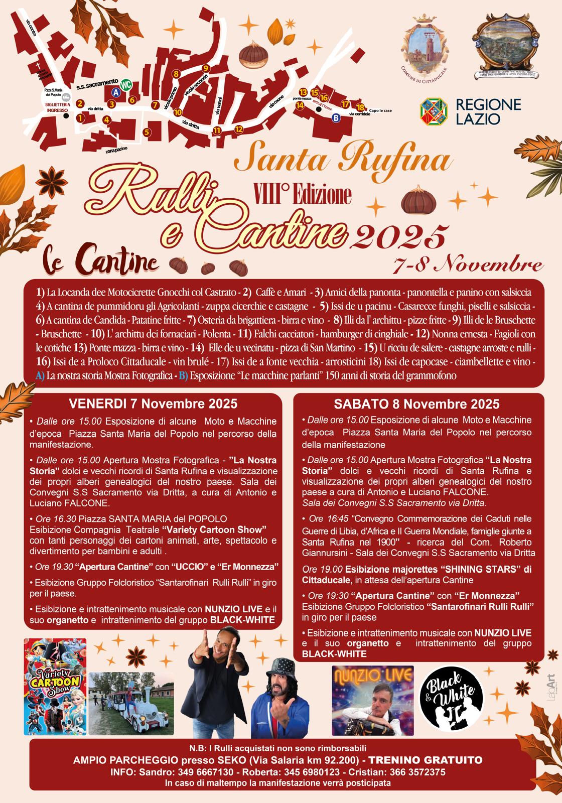 Torna uno degli appuntamenti più attesi dell’autunno nel nostro terriorio: la VIII edizione di “Rulli e Cantine”, in programma il 7 e 8 novembre 2025 a Santa Rufina di Cittaducale. Due giornate all’insegna dei sapori autentici, del divertimento e della convivialità, tra piatti tipici, musica e spettacoli per tutte le età.